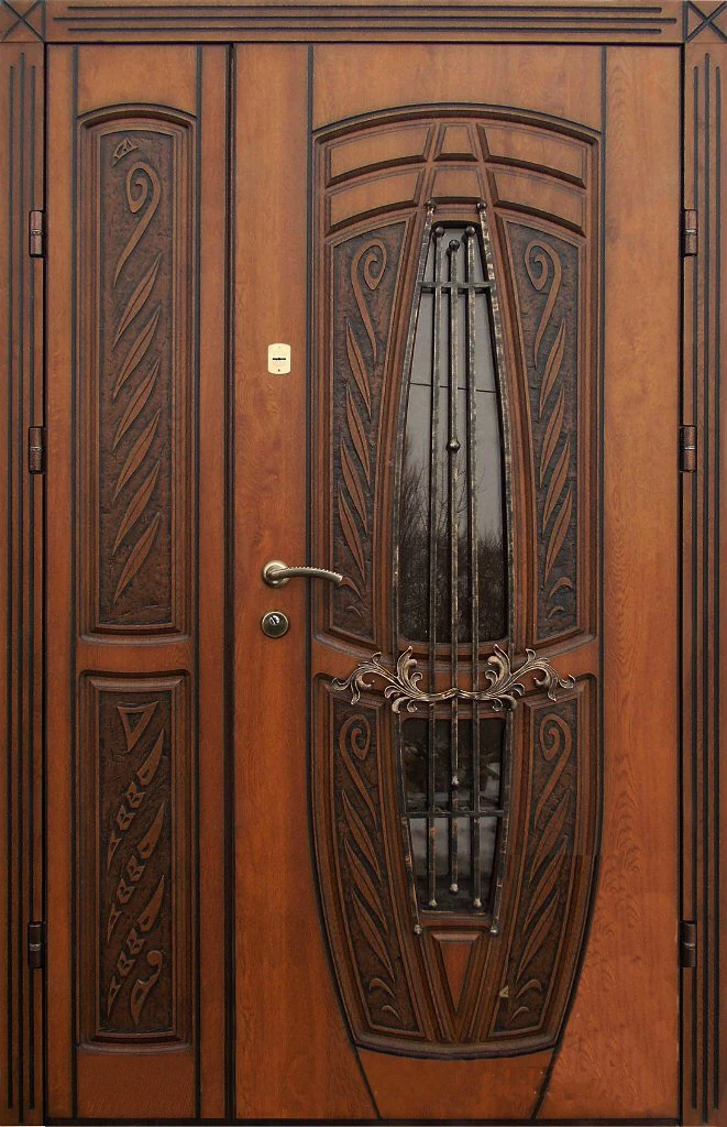 Поскольку в большинстве случаев устанавливаемые на входе в коттедж двустворчатые двери являются еще и предметом интерьера, украшающим здание, их дизайну предается особое значение. Эти двери, как правило, отделываются атмосферостойким МДФ, натуральным шпоном, массивом. Эффектно на таких дверях смотрится витражный узор, применение ковки, зеркальных элементов. Вариантов декора входной двустворчатой двери масса, тут все зависит от пожеланий заказчика.